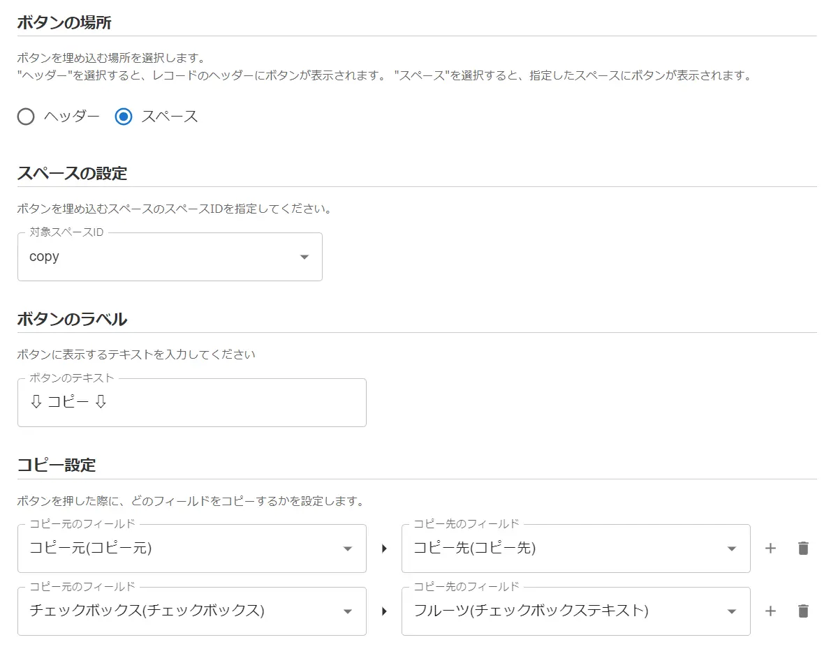 フィールドデータコピープラグインは、ヘッダーもしくは特定のスペースにボタンを設置し、 フィールドの値を別のフィールドへコピーするプラグインです。